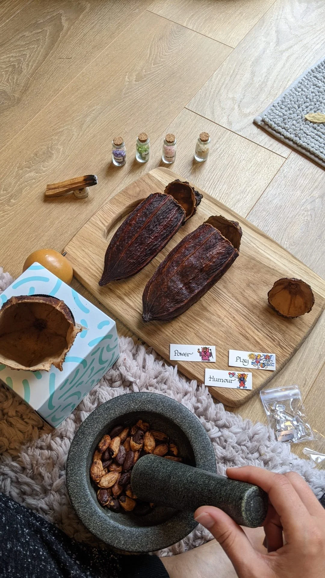 I roasted and ground up these beans, returning them back to their mother shell, adding Amethyst, Peridot, Clear Quartz, Moonstone and Rose Quartz to enhance the spiritual and love connection qualities of the Spirit of Cacao.
